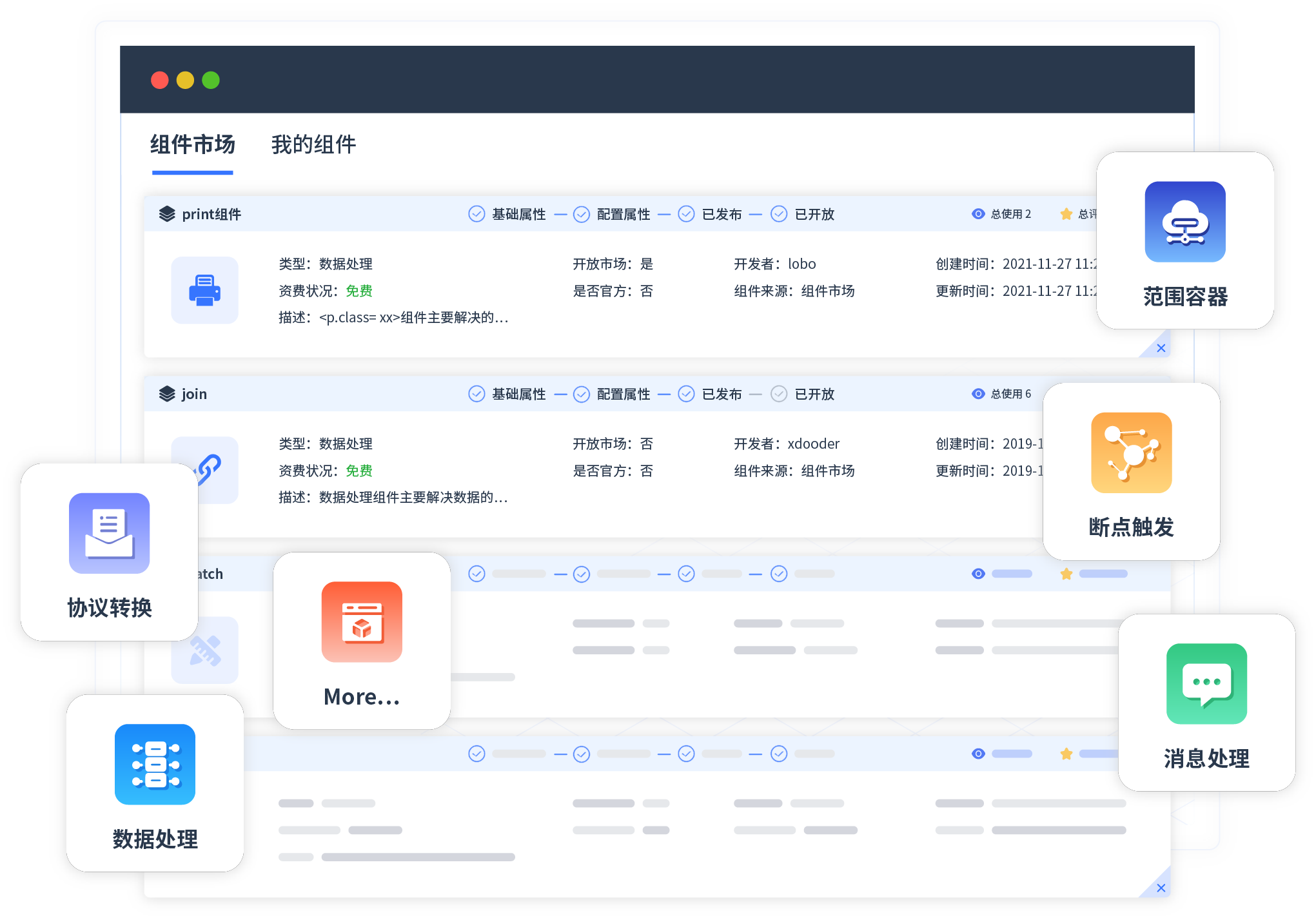 针对集成场景,壹号娱乐提供组件市场,例如协议转换、消息处理、文件操作等。除平台提供的组件外,客户可以自定义所需组件。