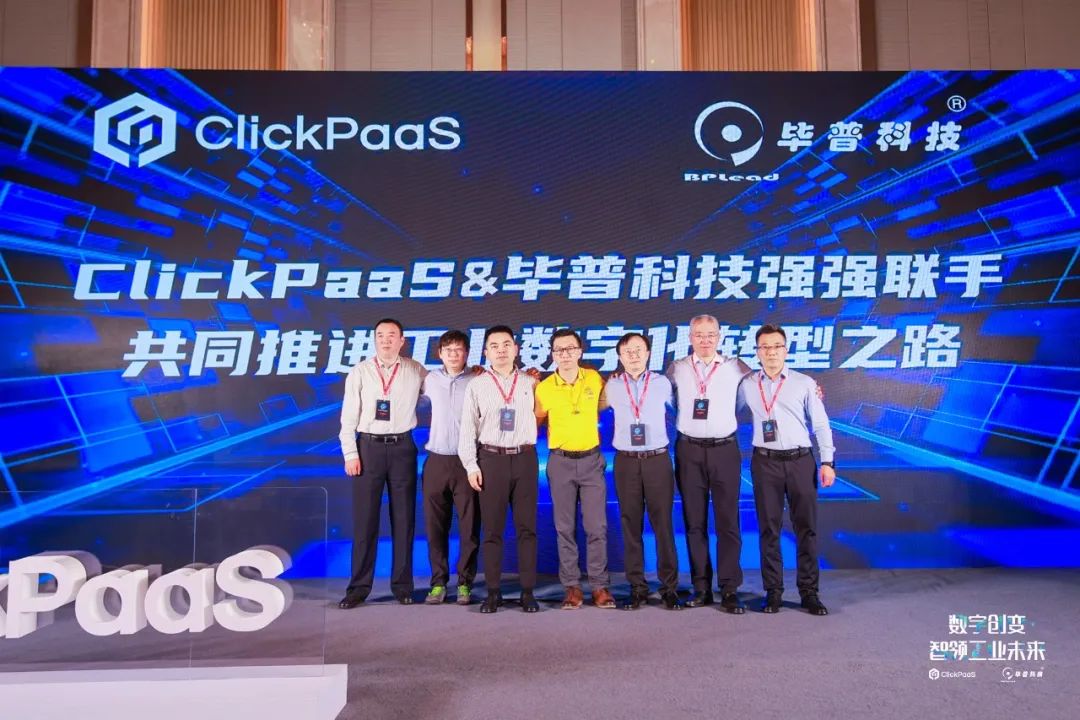 在万众瞩目下,壹号娱乐创始人、CEO胡柏,联合创始人、CTO王復兴,CSO汤滨,以及毕普科技的创始人曾令卫,毕普科技联合创始人许有利、营销副总张晓峰上台共同开启了CP&BP的工业数字化未来。